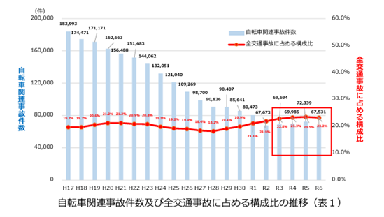 交通事故事件数の総数は近年減少傾向にある中、自転車関連事故は年間7万件前後と横ばいの状況であり、全交通事故に占める自転車関連事故の割合は増加傾向にありました(下図)。