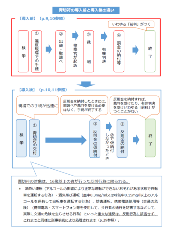 青色切符制度導入前は、違反行為の内容や程度によっては裁判にかけられ、罰金が科される可能性がありました(いわゆる赤切符での手続き)。他方で、制度導入後は、反則金を納付すれば同納付をもって手続が終了することになります。詳細は、以下の図をご参照ください。